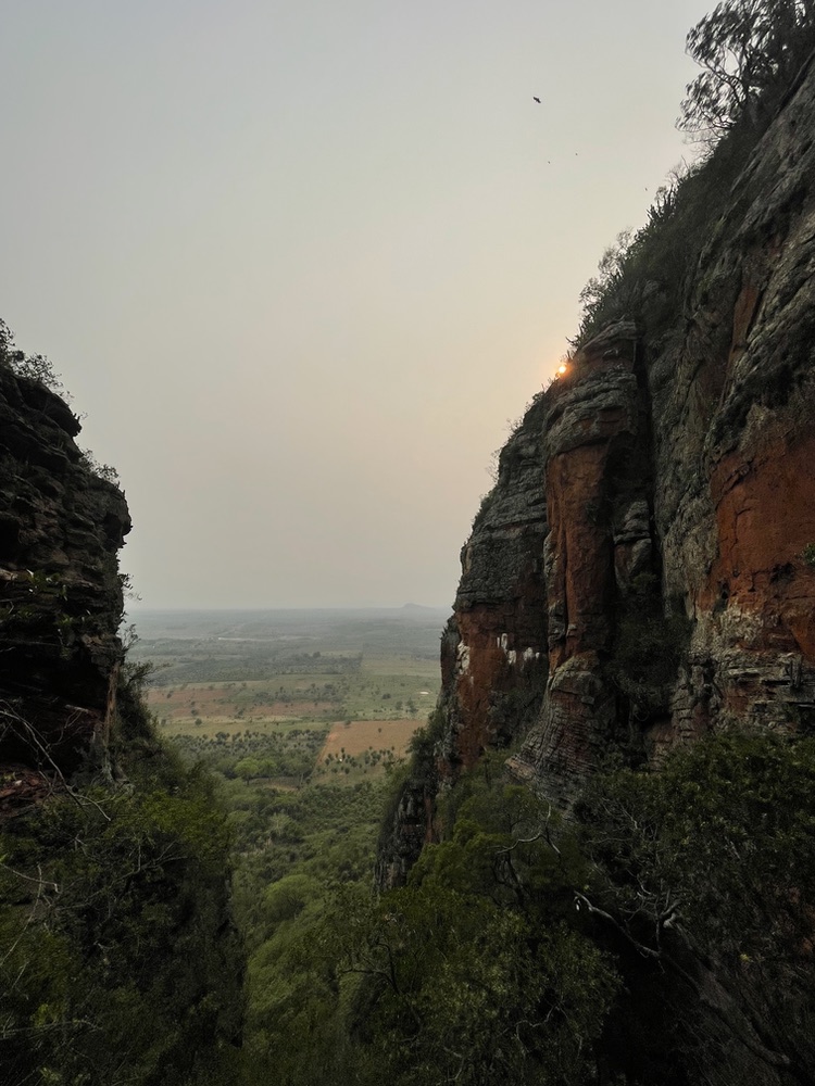 ’s Morgens gaan we ontbijt zoeken in het tankstation, maar dat blijft beperkt tot een veel te zoete Dolce Gusto cappucino en een koek die je mond nog droger trekt dan een lepel kaneel. Even later staan we echter al aan de voet van Cerro Memby, een rots die bereikbaar is via de landweg. Bereikbaar is een groot woord want het pad dat op de kaart staat is niet te zien en overal zitten er koeien achter draad. Op en over de draad, en wat verder toch een pad. Over een pas, dan langs de rots omhoog, tot we op een punt komen dat de veiligheid toch redelijk in het gedrang komt.
