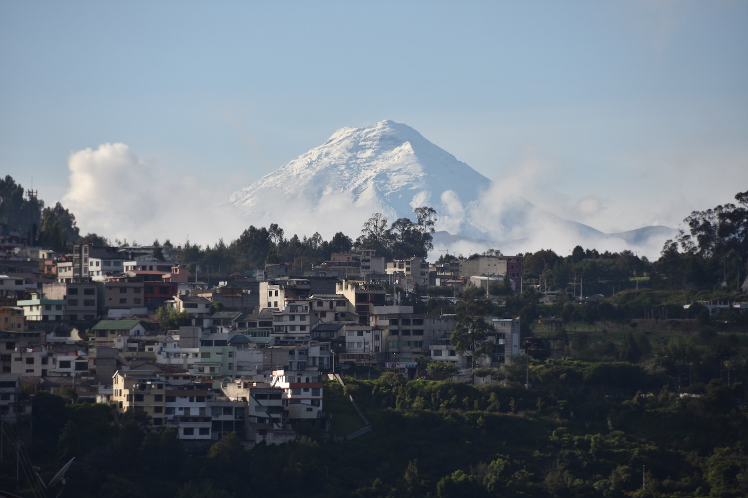 En toen zei Peter op een morgen “ah kijk, je kunt de Cotopaxi zien vandaag”. Dat was voldoende voor mij om mijn ontbijt even te laten staan en met mijn fototoestel naar het dakterras te lopen. Een hoop foto’s later kon ik terug verder eten en zag ik em rustig terug verdwijnen in de wolken.