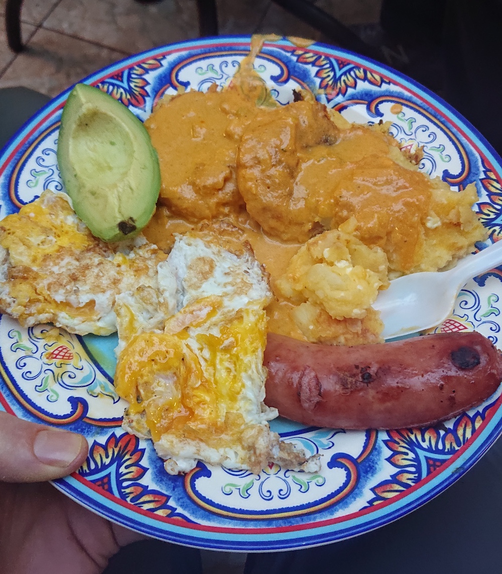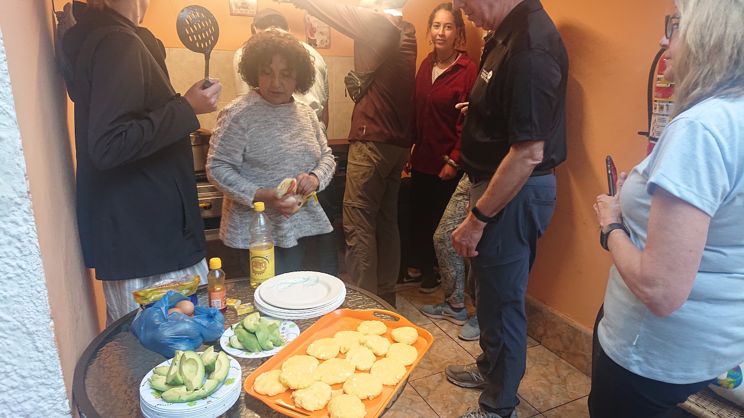 Woensdag stond er nog een extracurriculaire activiteit die ik wél wilde doen (de salsa les had ik overgeslaan): kookles, met op het menu Llapingachos. Aardappeltortillas, met ei, chorizo, avocado en pindadsaus. Geen lichte maaltijd. Conversaties waren in het Engels tot de kokkin er kwam bijstaan.
