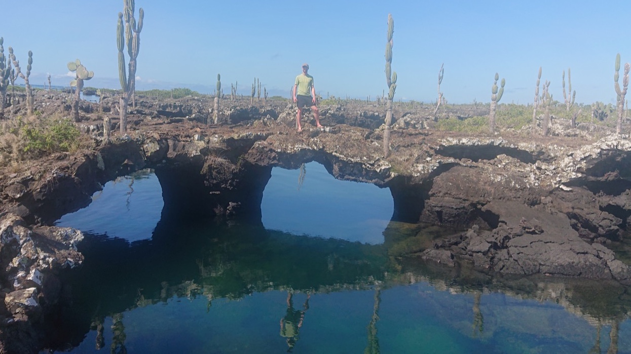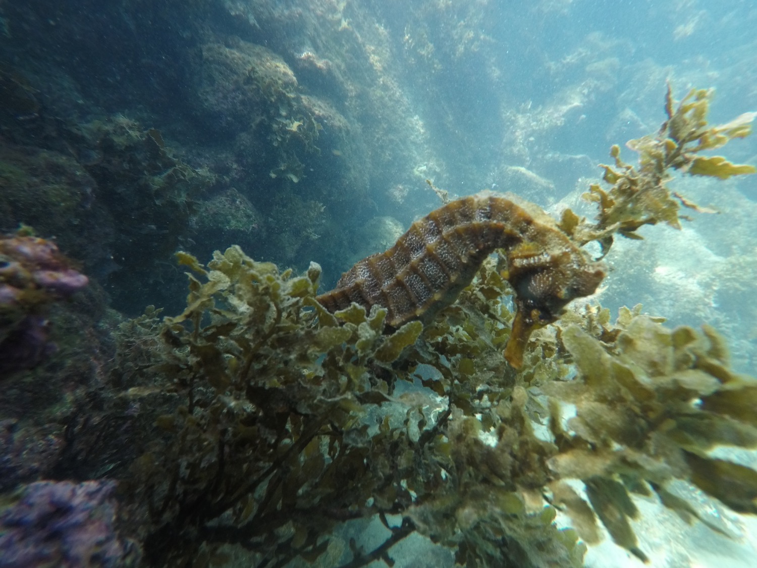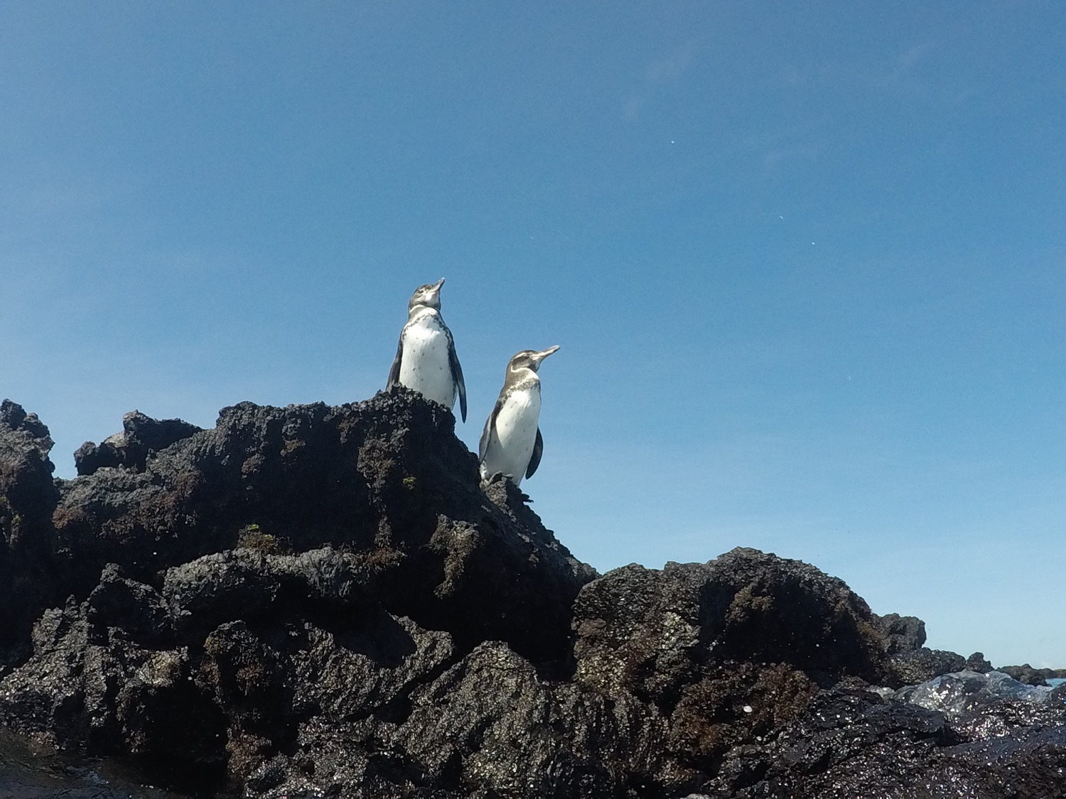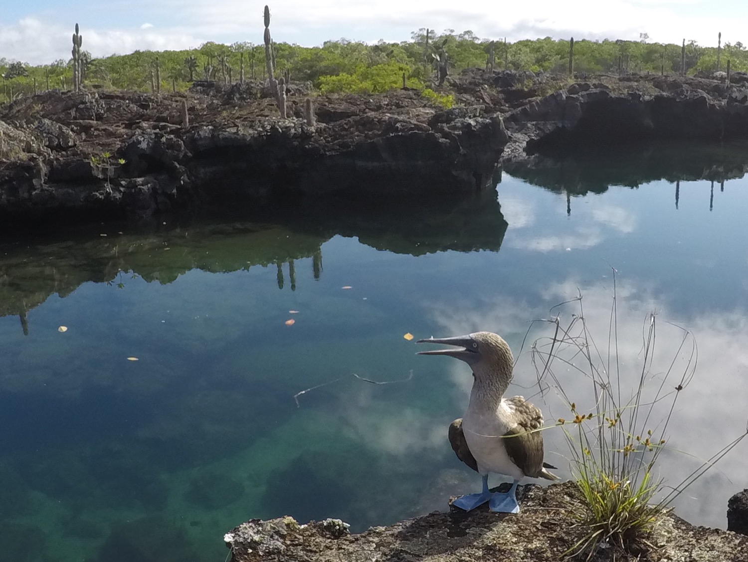 De dag erna heb ik de Túneles toer geboekt, dus geen free snorkling. Met de boot door een hoop bruggen in het water, ooit gemaakt door lavauitbarstingen van een van de vulkanen op het eiland. Het water is superhelder, dus we zien hier en daar een schildpad in het water, naast veel vissen. We gaan even aan land om de Bluefooted Boobies te zien. Die zijn juist aan het nesten, er zitten ook een paar jonkies die nog niet genoeg sardienen gegeten hebben om blauwe poten te krijgen. Ik was helaas niet voorbereid op veel rotswandelen en gleed uit met mijn flipflops, wat resulteerde in een snee in mijn teen. Crew van de boot weigerde een pleister te geven omdat die zou kunnen loskomen in het water en dat is vervuiling. Dus voet in het zoute water als ontsmetting, snorkelmateriaal aan en effe snorkelen aan de tunnels. De gids bracht ons via een paar scholen vissen naar een koppel pingiuns op een rots. Op de terugweg kregen we ook nog 2 grote zeepaardjes te zien, schittend!