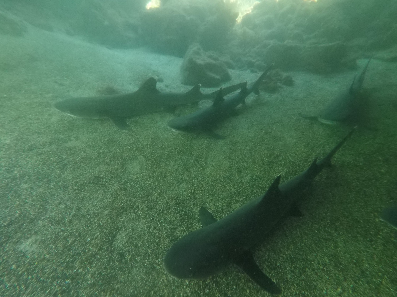 Iedereen terug de boot op en op naar de volgende snorkelspot. Na een stukje navigeren tussen de rotsen kregen we een hoop whitetip reefsharks, die aan het rusten waren onder een rots, gevolgd door een tiental serieus grote schildpadden die rustig aan het eten waren en ons volledig negeerden, met op het einde nog een stingray die zichzelf aan het ingraven was. Geen zeepaardjes meer, maar een supersnorkeltocht, ik kon gerust nog een uurtje blijven.