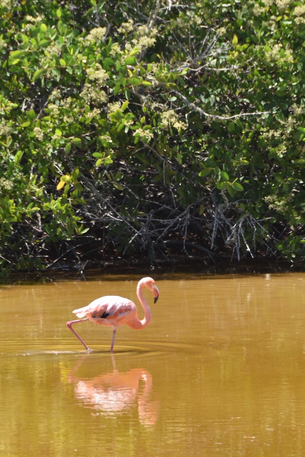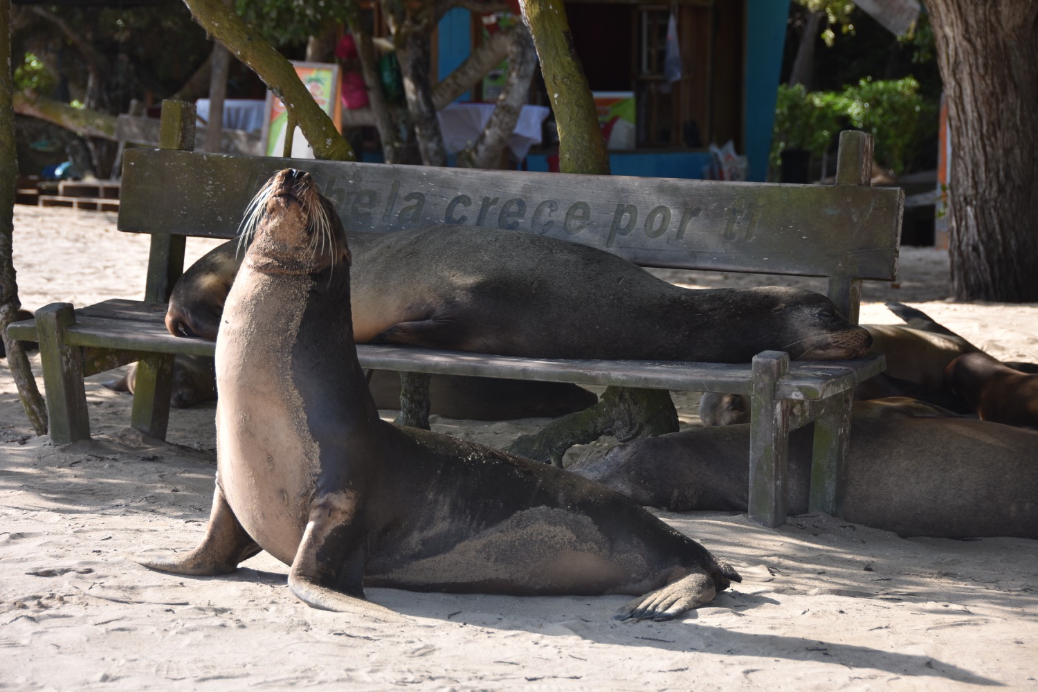 Na een paar uurtjes rondwandelen moest ik alweer naar binnen en koude douche pakken. Wat ik echter gezien had, stond mij wel aan: de stad was eigenlijk een dorp, verharde weg ipv beton/asfalt, direct aan het strand, dat voor een kilometer of 2 doorliep, pelikanen en boobies die aan het vissen zijn op 5 meter van de waterlijn, een paar verloren gelopen flamingo’s, teveel om op te noemen. Na de koude douche besluit ik de free snorkling uit te proberen aan Concha de Perla. Na een korte wandeling sta ik alweer volledig in het zweet en voelen mijn kuiten verbrand, dus voelt het heel goed om in het koele water te gaan. Helaas is de zichtbaarheid niet super en is er niet veel activiteit in het water, het wat toch leuk zwemmen. Later leerde ik het beter is ‘s morgens te gaan (editors note: dat is nooit gelukt). Op het strandje ernaast lagen er ook een hoop zeeleeuwen te pitten in de schaduw, de zitbanken zijn allemaal in gebruik. Ertussen liggen er nog wat iguanen om het plaatsje af te maken. ‘s Avonds kom ik wat bekend volk tegen op een pleintje met een paar BBQ’s en gaan we nog eentje drinken aan het strand. Leuke plaats, dit eiland!
