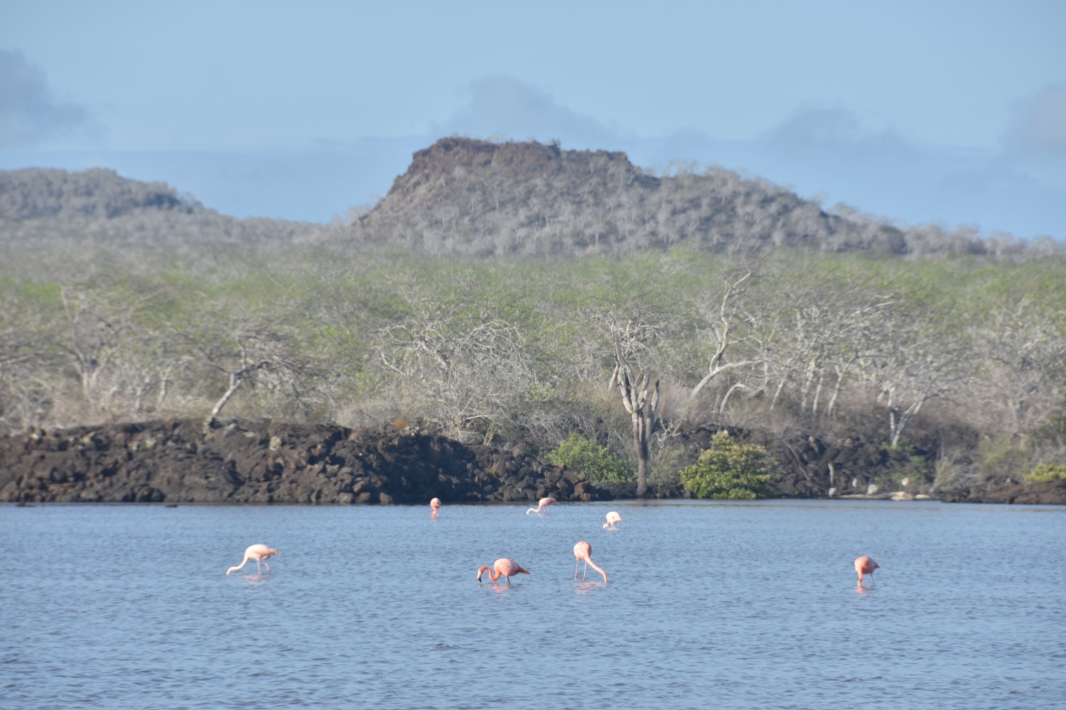 De volgende morgen werden we weer wakker voor een ander eiland, Floreana. Na een vroeg ontbijt gingen we aan land op zoek naar flamingo’s. Die waren niet moeilijk te spotten, er waren er genoeg. Geen populaties zoals in Afrika, maar wel de Galapagos variant. Daarna gingen we roggen vissen in de branding. Het werd al vlug duidelijk waarom die zich daar ophouden, want we zagen in diezelfde branding ook een haai die op zoek was naar voorgenoemde roggen. Verder dreven er tientallen schildpadden voor de kust, want het zand achter het strand wordt ‘s nachts gebruikt om eieren te leggen. Daarna deden we een drift snorkel, gewoon met de stroming meegaan. Helaas beetje lastig als je iets ziet, dat je graag wat langer zou willen bekijken :-) Wederom ferm de moeite wel.