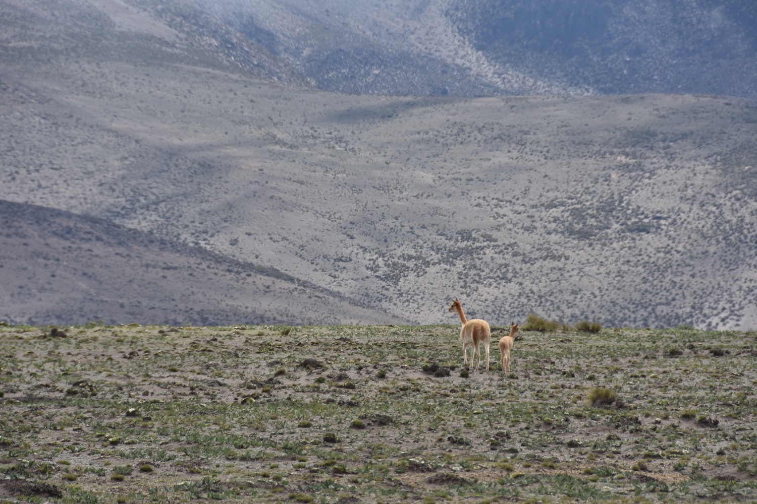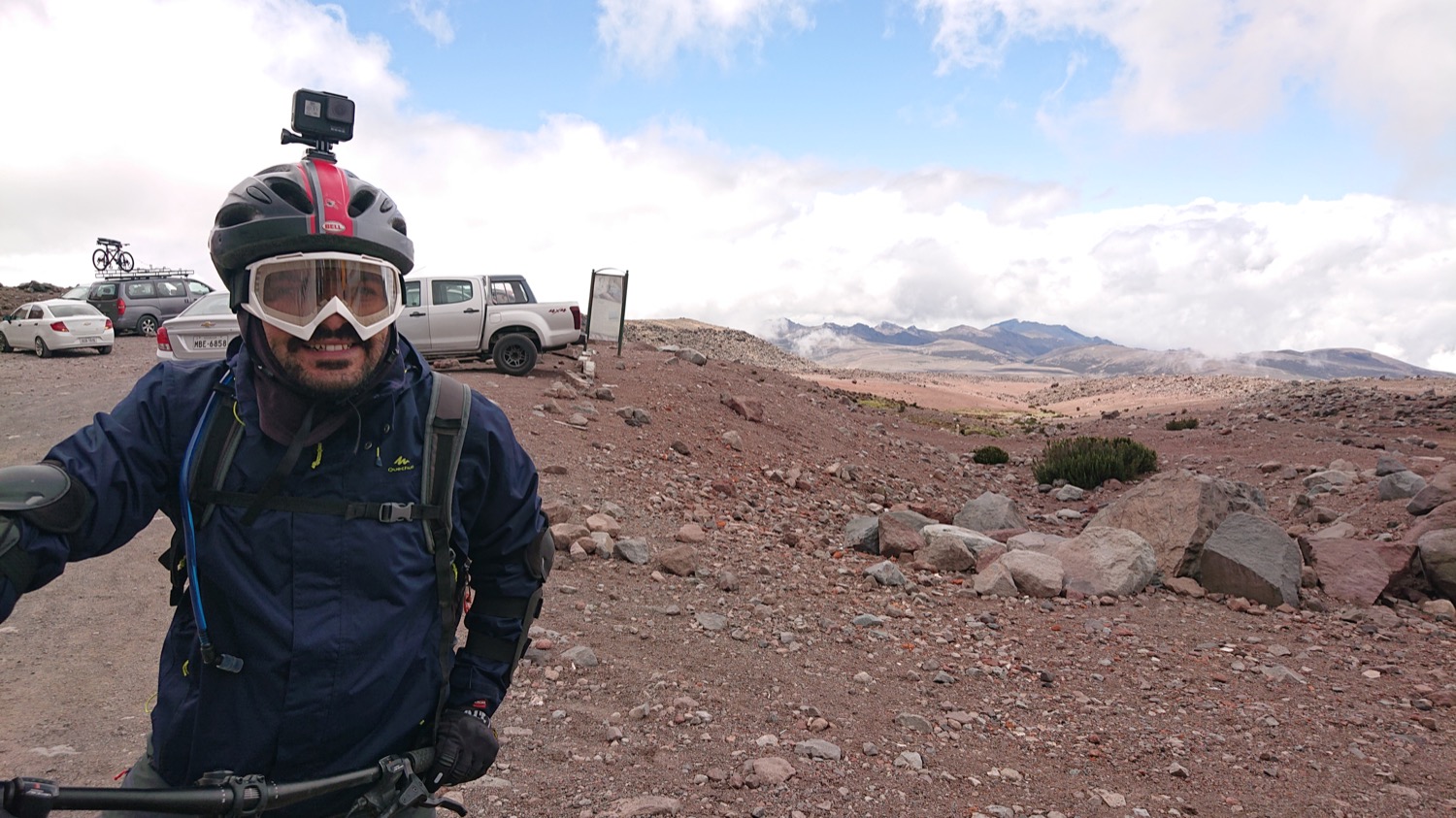 Terug beneden werden de fietsen afgesteld, we kregen been- en elleboogbeschermers, een korte uitleg van de gebaren van de gids en hop we waren op weg naar beneden. Eerst ging het nog wat langs de veldweg waar de auto’s ook op reden, maar dan mochten we offroad, door het vulkanisch “zand” dat normaal is voor deze hoogte. Het landschap was bezaaid met steken, dus veel fouten moest je ook niet maken. De gids gaf echter de weg en de snelheid aan en al vlug zoefden we naar beneden door een desolaat landschap (die ene vicuña daargelaten). Al te vlug stonden we terug bij het kantoor van het Nationaal park en de autoweg, die we normaal zouden volgen tot aan de lunchstop (die tevens het einde was). De gids had echter genoeg gezien op de 8 km die we net gesjeesd hadden en beloofde ons wat meer offroad. Een kilometer of 2 verder mochten we van de autoweg af en vervolgden we onze weg offroad. Dit stuk was direct een pak technischer, geultjes, korte steile afdalingen en zandstroken wisselden elkaar vlug af. Hoewel ik weinig ervaring heb met downhill biking, slaagde ik er toch in om niet op mijn bek te gaan. Dat, samen met het wonderlijke gevoel van zonder al te veel moeite door het landschap te corssen, deed mij nadenken over misschien wel een nieuwe hobby. Wel wat moeilijker in het platte België natuurlijk, plus je hebt ook een busje en chauffeur nodig, anders moet effectief terug naar boven fietsen, niemand die daar veel zin in heeft natuurlijk. We kregen onderweg nog een glimps te zien van de vulkaan, maar ook nu duurde dat niet lang. Na nog een stukje offroad en een laatste klimmentje ging de tocht helaas verder via de weg. Hoewel de snelheden nu wel wat hoger lagen, moesten we af en toe inhouden voor voorbijstekende auto’s en was het landschap ook wat minder. Uiteindelijk kwamen we aan in San Jose, waar we een lekkere lunch kregen in een lokaal restaurantje, waarna we terug naar Riobamba reden.