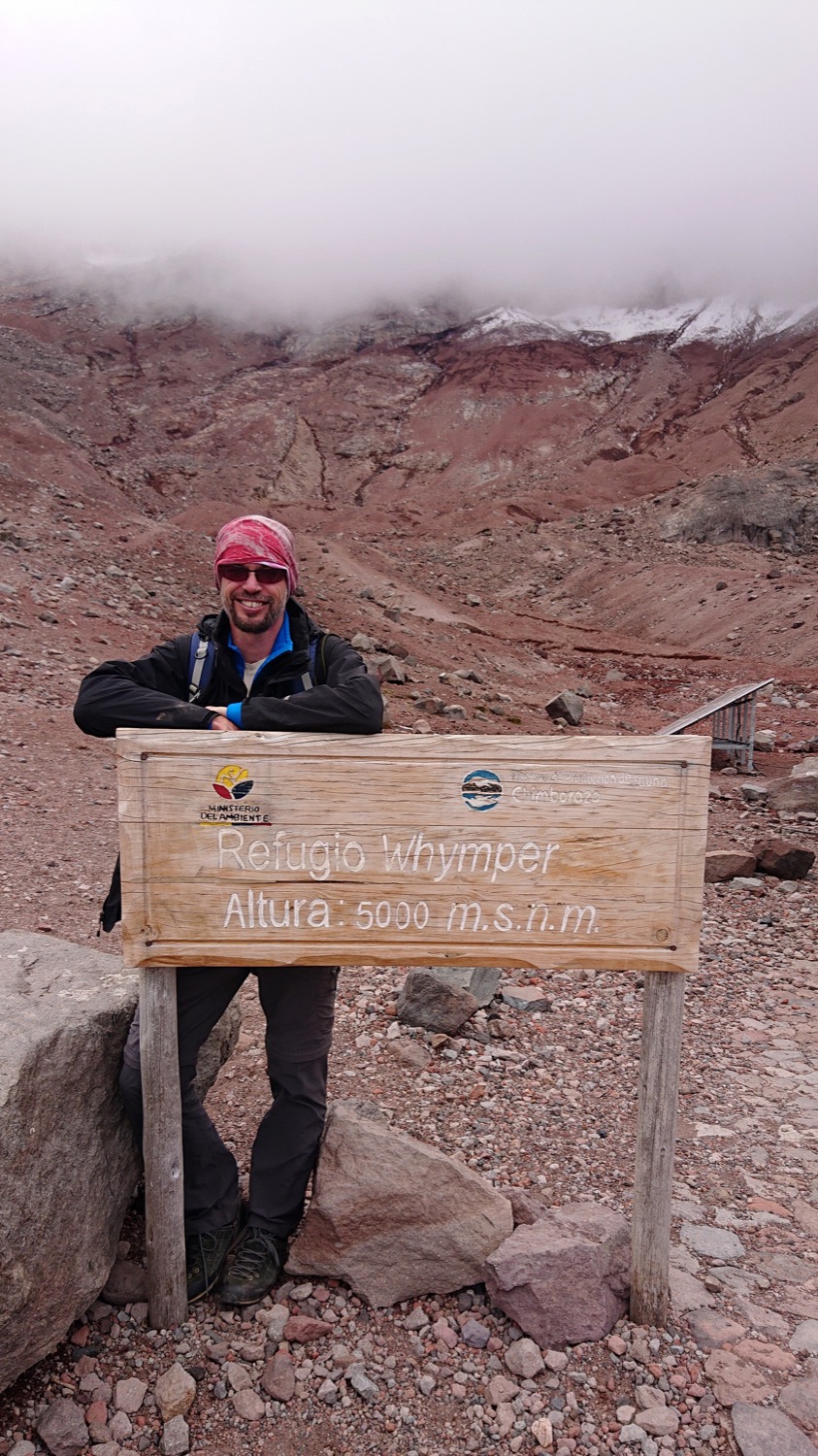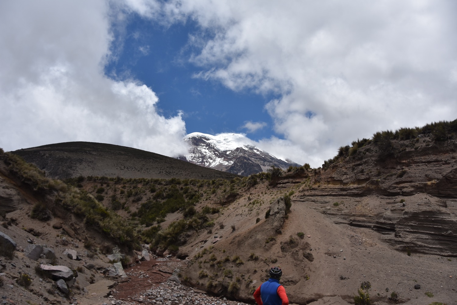Het ontbijtbuffet de volgende morgen was best uitgebreid en met oog op een wandeling op 5000 meter stak ik mij vol met fruit, brood en eieren. Half uurtje later was ik aan het bekomen van een indigestie, but the show must go on. Een korte busrit later stonden we aan het kantoor van de toeroperator. Daar mochten we een fiets passen en kregen we ook al de helft van onze fietsuitrusting (helm, muts, handschoenen). We maakten er ook kennis met onze medefietsers, 3 Amerikanen die voor 9 dagen in Ecuador waren en die dat dus lang voordien geboekt hadden. Toffe gasten, op zijn Amerikaans wel, waarbij alles “amazing” is. De busrit naar de eerste refuge van Chimboraza werd een paar keer onderbroken omdat we de vulkaan zagen door de wolken heen en omdat er een bende vicuña’s over straat liepen. Het landschap was daar al redelijk droog en woestijnachtig, vraag je je toch weer af wat die beesten daar eigenlijk doen. Bij de refuge merkten we al direct het verschil in zuurstof. We kregen er een coca-thee van de gids en daarna mochten we tot aan de volgende refuge wandelen, de gids bleef daarbij in de lekker warme bar wachten. De wandeling zelf was niet speciaal, het duurde even voordat ik het juiste ritme vond om niet constant in ademnood te komen, maar eens ik dat had, ging het wel vlot omhoog. Af en toe kregen we een glimps van de top van de vulkaan, maar steeds werd dat vlug verborgen door de vele wolken die op deze hoogte geen uitzondering zijn. In de tweede refuge waren de WC’s gesloten daardat de waterleiding kapot was, dus ging ik een eind verder tegen een rots pissen, er was dan ook niemand om erover te klagen. Veel kregen we de vulkaan niet meer te zien helaas, het wolkendek ging definitief op slot.