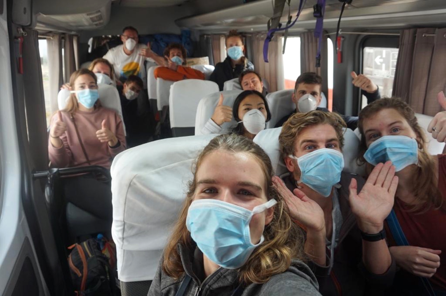 Er is superveel volk rond onze bus, er worden foto’s genomen door de toeristische dienst, het is duidelijk een goed moment voor een beetje promotie. Wel te begrijpen want toerisme gaat even stilliggen, dus kun je maar beter goed in het nieuws komen met wat je doet voor je toeristen in tijden van crisis. Ik grijp de plaats met beenruimte in de bus, das de laatste rij, met zetels die niet kunnen versteld worden, naast een paar dozen waarvan de inhoud niet gekend is en een paar wandelstokken ter hoogte van mijn hoofd. Al vlug werd duidelijk dat dat geen beste keuze was, maar we zijn op weg!