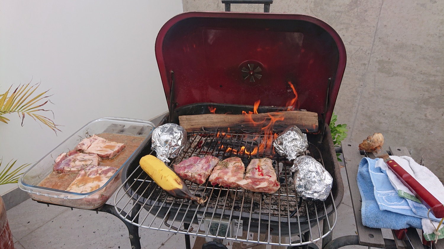 ’s Morgens leende ik een yogamatje van Julia en koos ik spontaan voor het verkeerde terras, waardoor het yogamatje en mijn voeten vuil waren. Half uurtje later was ik echter genoeg opgewarmd om het yogamatje af te wassen. Een lekker, uitgebreid ontbijt later was ik klaar voor een nieuwe dag, waarbij er voornamelijk weer veel gepraat werd :) De Peruaanse overheid had besloten om de mannen en vrouwen apart op straat te laten, en vandaag was het enkel mannen. Dus gingen Piete en ik de alweer geslonken biervoorraad nog wat aanvullen. De eerste supermarkt bleek populair te zijn, daar stond een rij van 50-60 meter aan te schuiven. Blijkbaar gaat het wat trager als de mannen moeten shoppen, ze zijn dat misschien niet gewoon in Peru. De volgende winkel was rustiger toen we binnengingen, maar toen we buitenkwamen, was er ook al een pak volk aan het aanschuiven. Geen probleem voor ons, wij hadden alles dat we nodig hadden. De BBQ werd opgezet, het vlees gemarineerd, het bier voorgeproefd. Er was nog de vraag hoe we zouden BBQ’en met hout ipv kolen, maar Pieter had al genoeg in Argentinië geweest om iets af te weten van BBQ’en. Het duurde even vooraleer er voldoende bruikbare warmte was, maar daarna begon het bakken. Een continue stroom van steak, koeribbetjes en varkensribbetjes werd afgesloten met een sublieme forel papillot. Lang geleden dat ik nog zo lekker gegeten heb, budget reizen is ook niet alles.