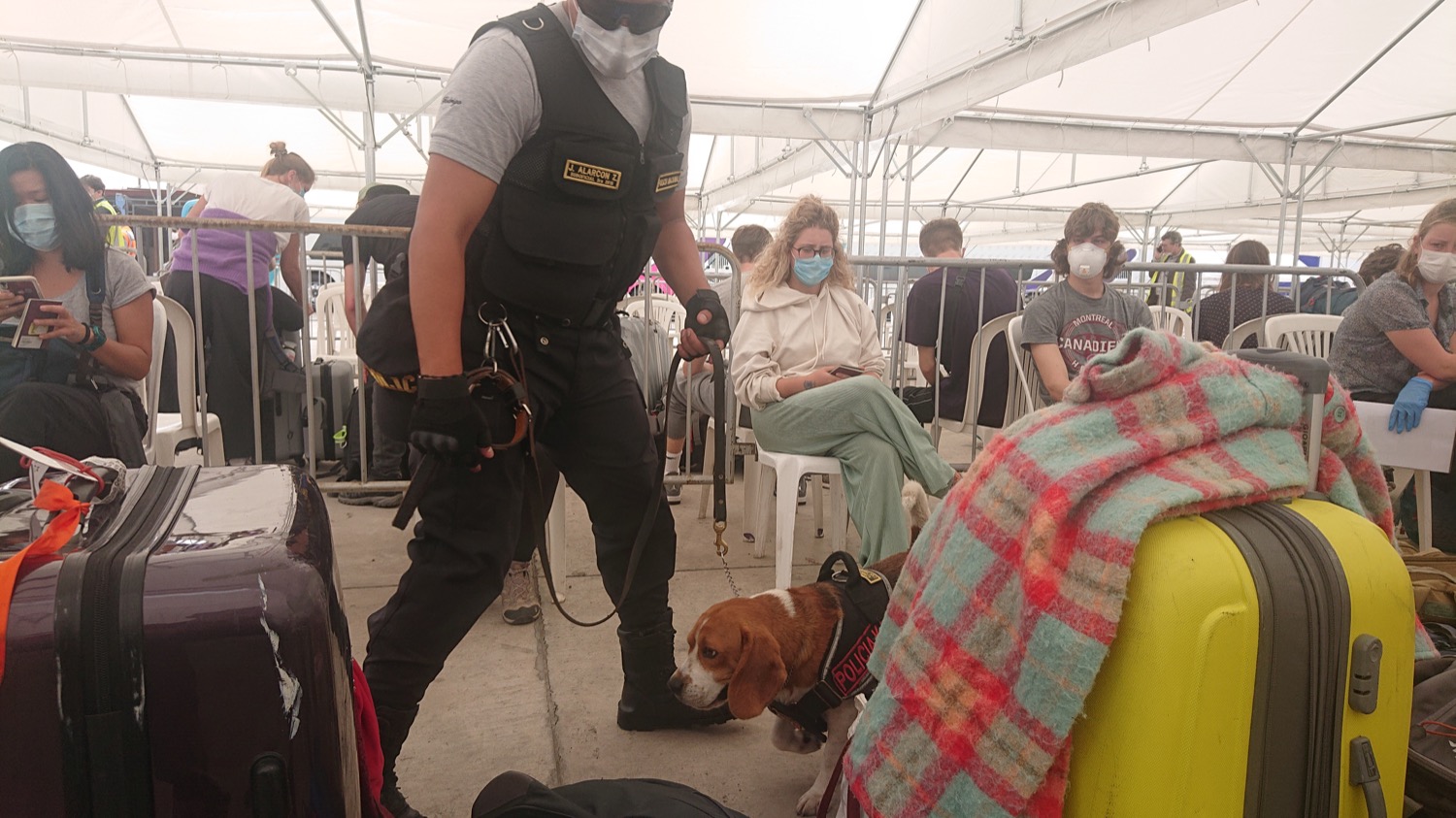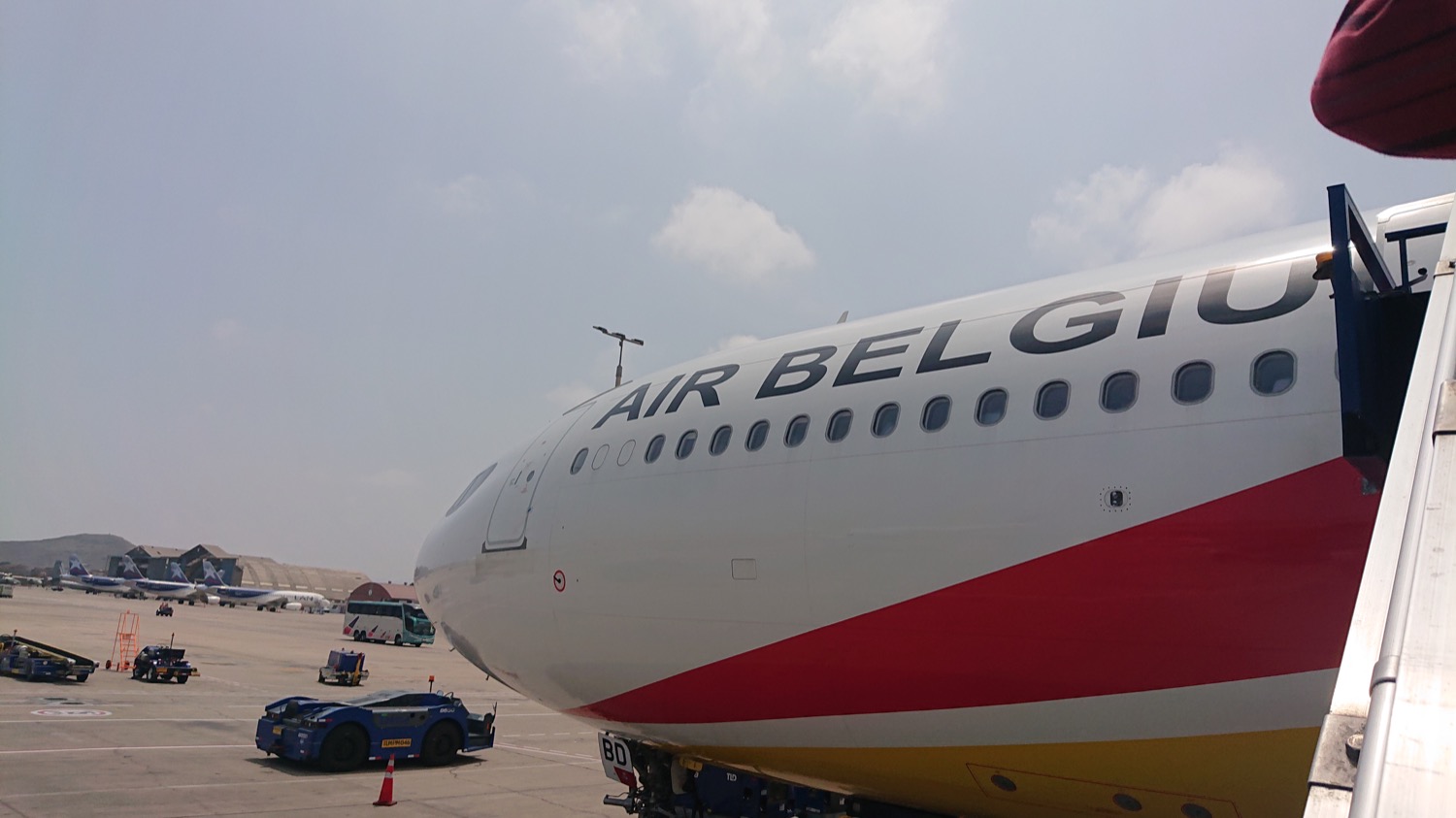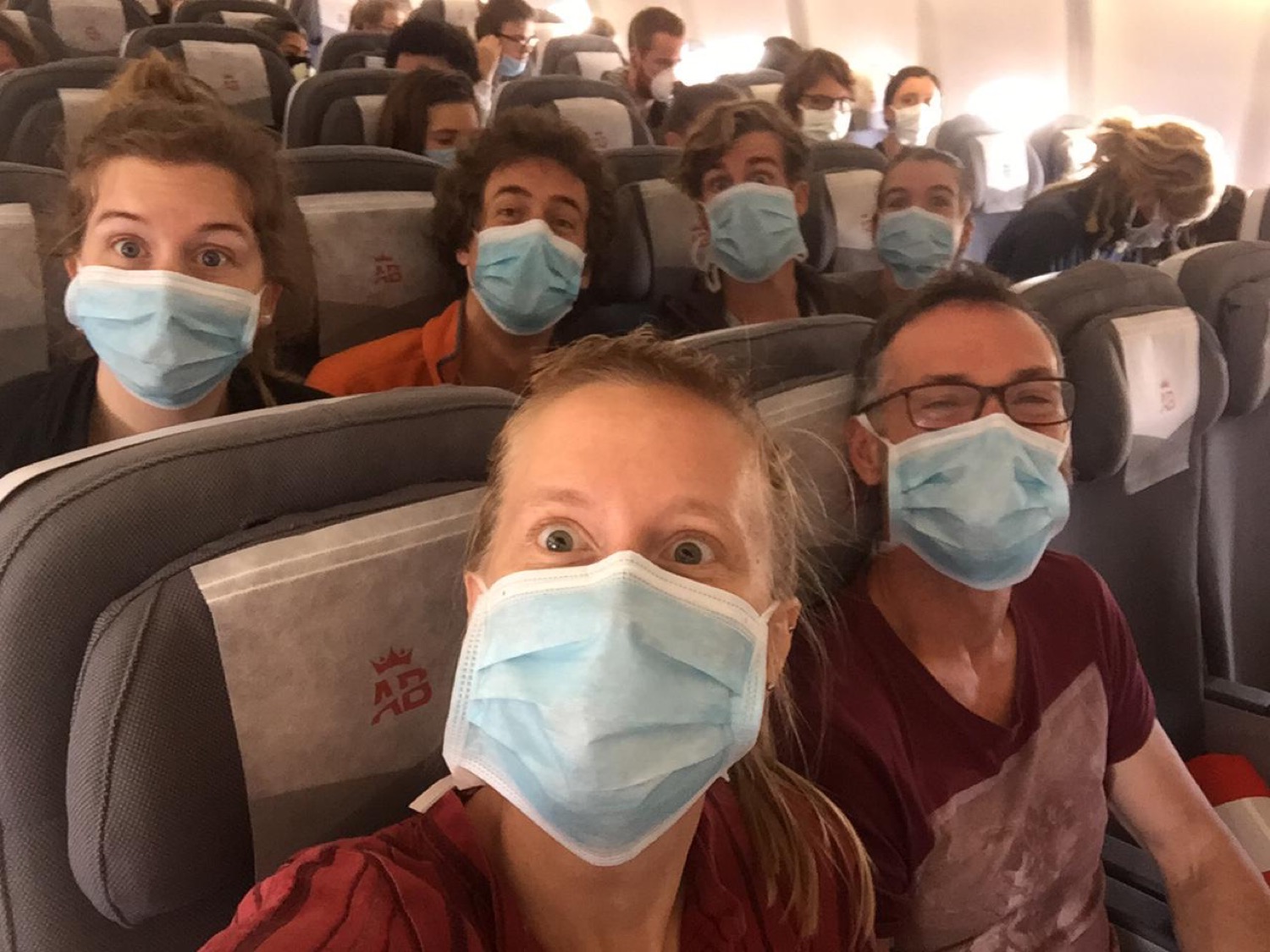 We zaten al vlug op de bus, waar we nog 2 uur bleven zitten. Gespreksonderwerpen waren de verhalen van de rijen aan de winkels in Lima, de plannen voor de quarantaine in Europa en erna en met hoeveel vertraging de vlucht zou vertrekken. Uiteindelijk baande de kolonne zich een weg door Lima naar de militaire luchthaven. De vlucht was er eentje van Air Belgium, een nobele onbekende bij ongeveer iedereen, de Belgen voorop. Maar een vliegtuig is een vliegtuig, dus we klaagden niet. Eens op de luchthaven, mochten we plaatsnemen op plastieken stoeltjes, waarna er twee honden passeerden om de baggage te controleren. Vloeistoffen, messen en vuurwapens mochten voor 1 keer wel mee met de handbaggage, wat het kon het hen ook schelen, hoe vlugger die zieke Europeanen uit het land waren, hoe beter. We kregen nog een checkout stempel en baggageticketje en dan we mochten op het vliegtuig.